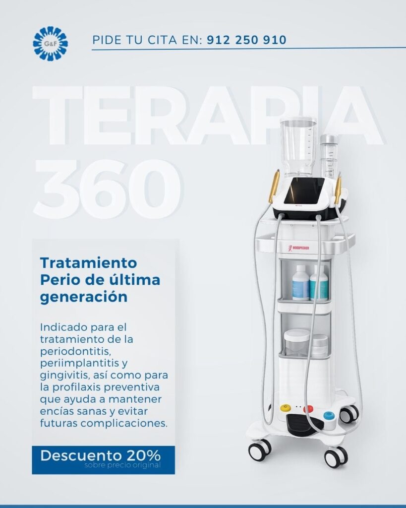 Descubre nuestra Terapia 360, un tratamiento periodontal de última generación indicado para combatir la periodontitis, periimplantitis y gingivitis, así como para realizar profilaxis preventiva y mantener unas encías sanas a largo plazo.
